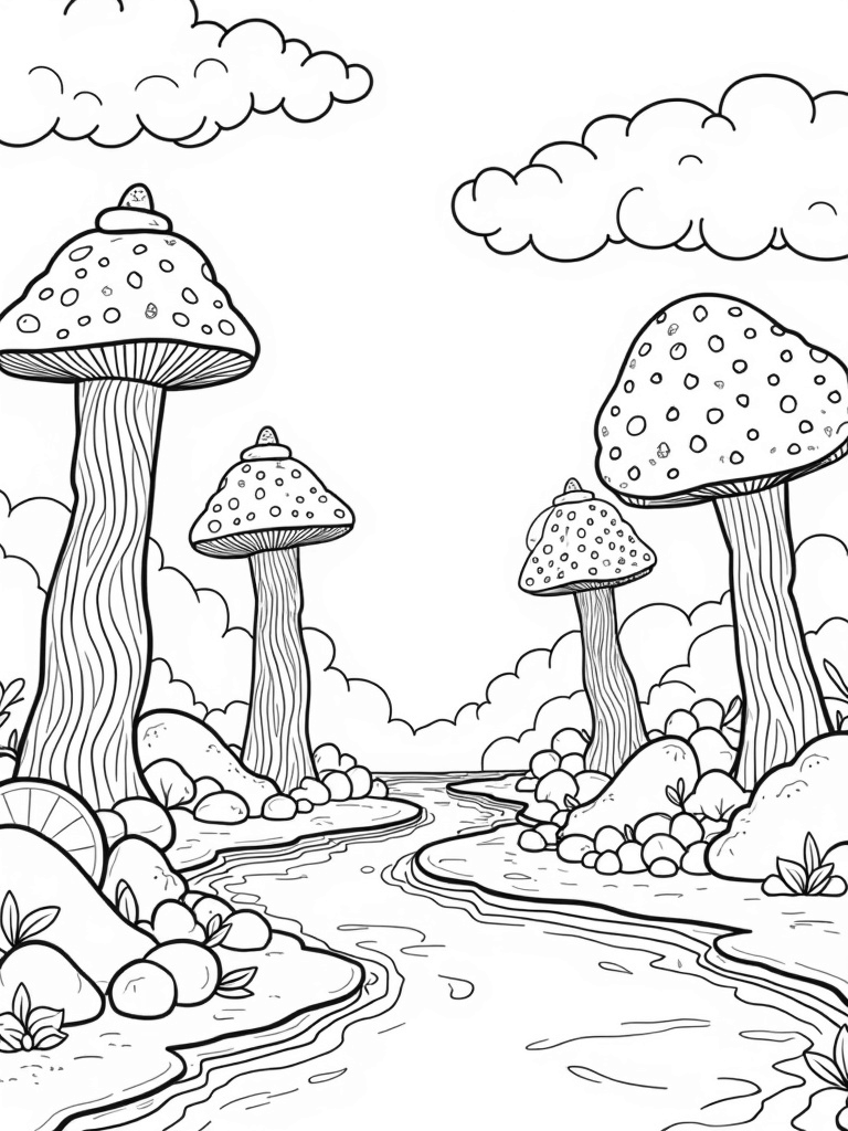 In this sweet scene, giant fruit slices serve as cozy benches where you can sit and enjoy the view. And don’t forget to look up! A fluffy cloud of cotton candy floats lazily above, casting playful shadows on the ground. It’s a place where imagination runs wild, and every corner has something delightful to discover. Grab your crayons and get ready to bring this delicious landscape to life!
