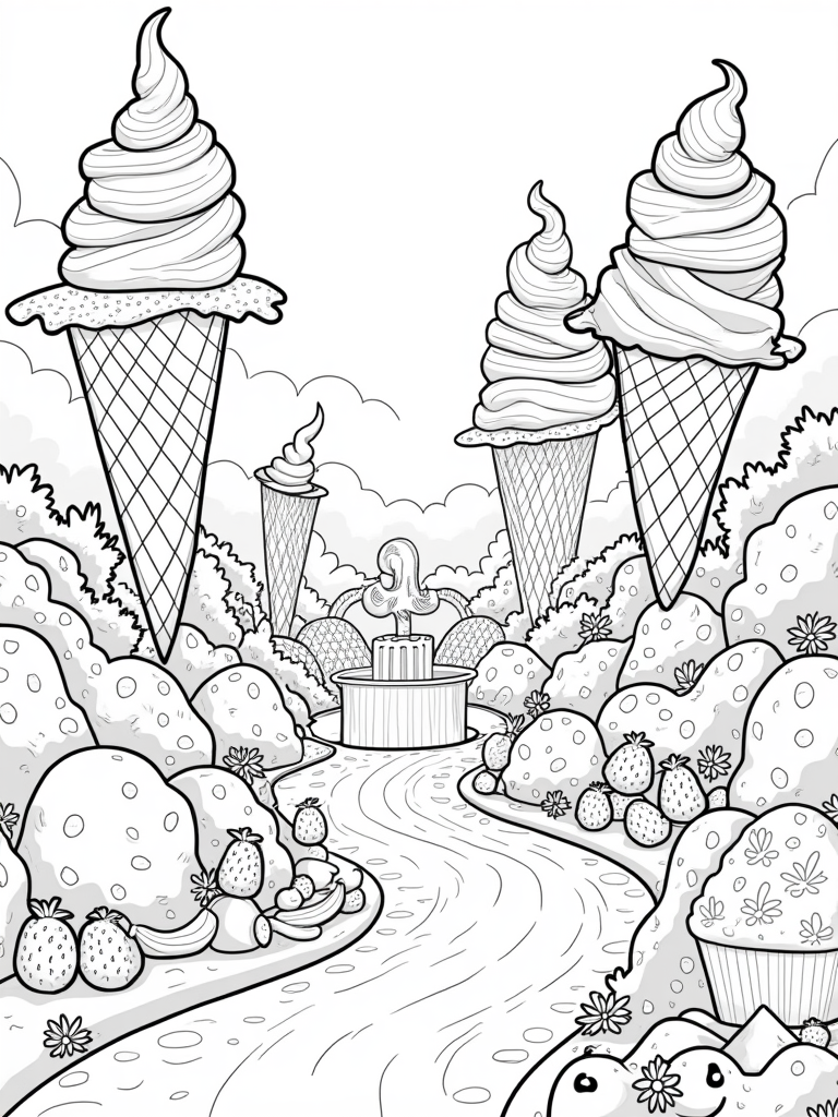 Check out this free, printable coloring page featuring a food forest filled with ice cream cone trees, candy paths, and joyful fruit characters. Perfect for kids who love to color and use their imagination!