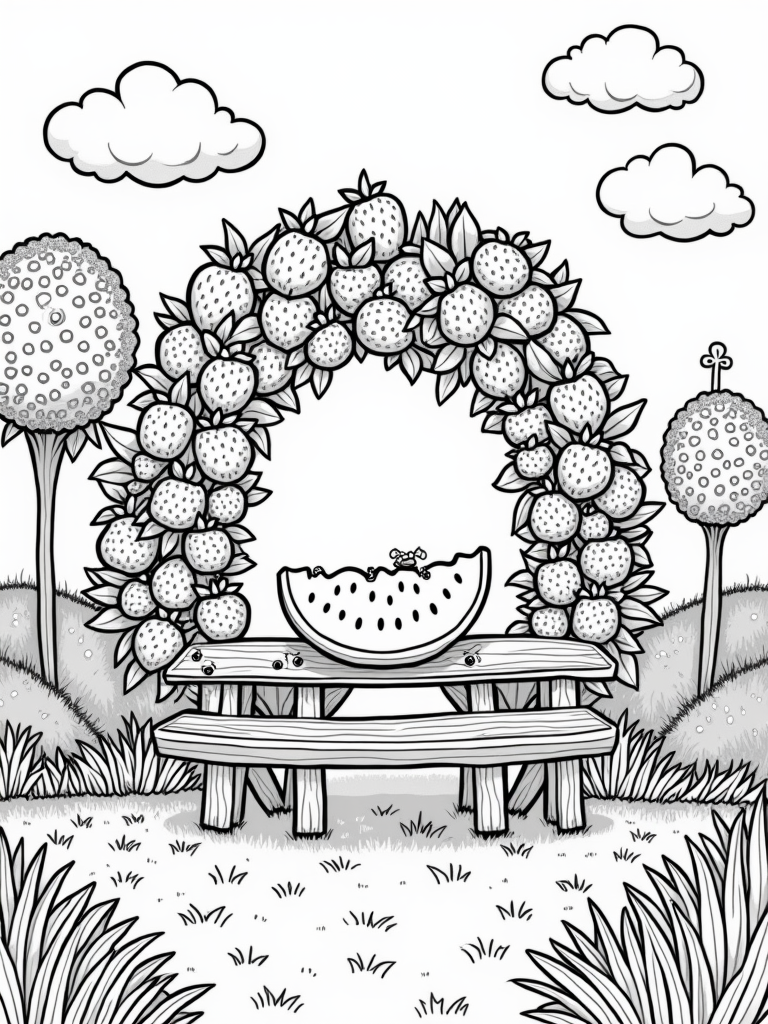 Check out this free printable coloring page featuring a whimsical fruit garden with a watermelon picnic table and a cupcake tree! Perfect for kids who love fun food themes, it's a great way to spark creativity and have some coloring fun.