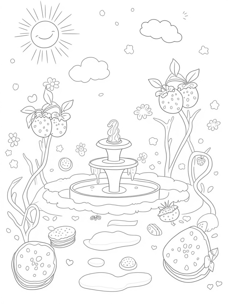 Fruit Garden with Chocolate Fountain and Macarons Coloring Page