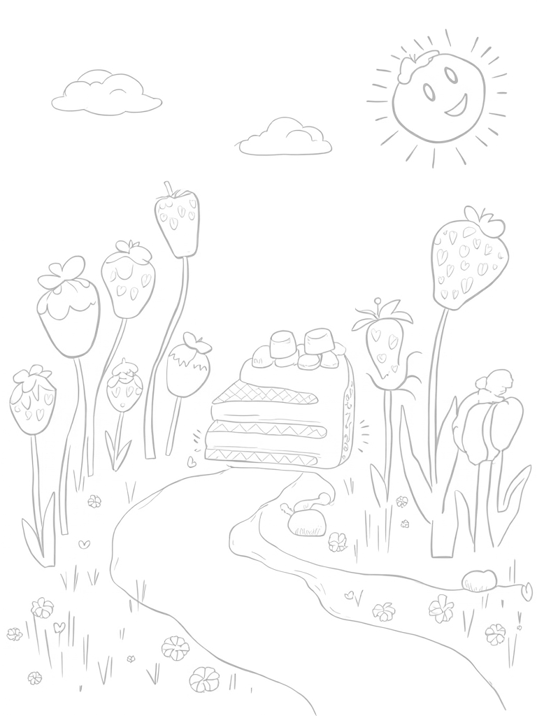 Imagine a garden where strawberries grow taller than you! In this colorful scene, you'll find these oversized berries blooming like flowers on green stems. A winding river of delicious chocolate flows nearby, surrounded by soft marshmallow rocks that look oh-so-tasty. But that’s not all! A giant slice of cake serves as a bridge, covered in swirls of frosting and colorful sprinkles, inviting you to cross over.