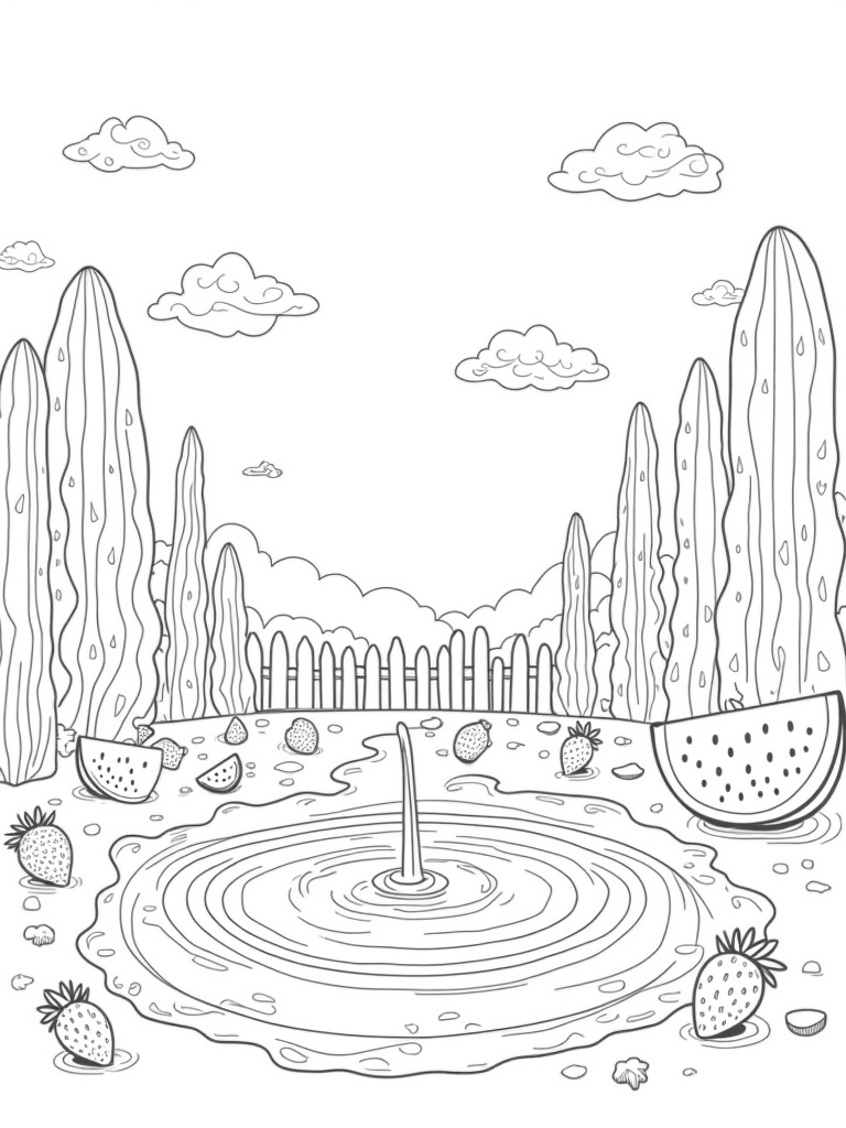 This coloring page brings to life a delightful fruit garden where watermelon trees are simply bursting with juicy slices instead of regular fruit. Can you imagine climbing one of those trees to grab a slice? Below, there’s a bubbly fountain that flows with refreshing orange juice, creating a fun spot for all the gummy fish swimming around in the sparkling pool!