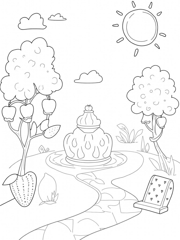 In the background, a cheerful sun made entirely of lemon slices beams down, radiating flavor-filled rays. It’s such a happy addition to this whimsical orchard, making everything feel extra bright and sunny. Grab your crayons and let your imagination run wild!