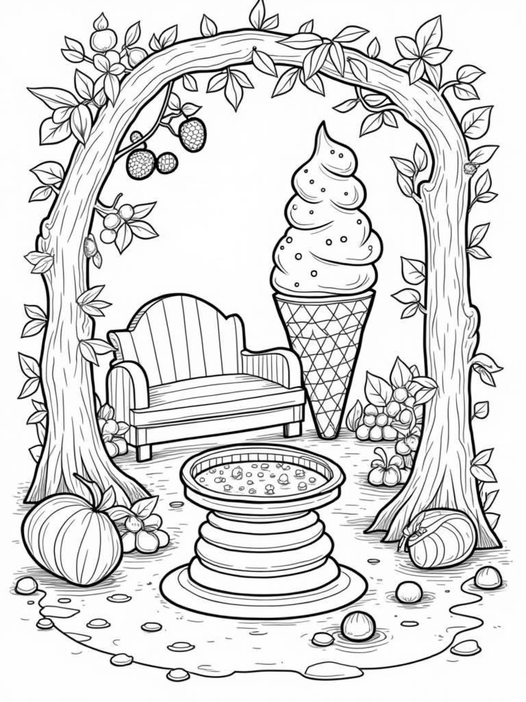 This delightful scene captures a fruit orchard where oversized fruits dangle from twisting branches. Right in the middle, a giant watermelon acts as a cozy seating area, with its rind shaped into a circular bench. Nearby, an ice cream cone tower stretches high into the sky, all decked out with colorful, swirly sprinkles. It's a sweet spot for any little artist!