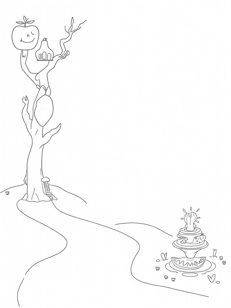 This coloring page shows a delightful fruit orchard where oversized fruits dangle from twisted branches. At the center, a giant, smiling apple has been transformed into a cozy treehouse, complete with windows and a ladder for little adventurers to climb up. Nearby, a pear-shaped hot air balloon drifts lazily in the sky, tied to a basket made of grape vines.