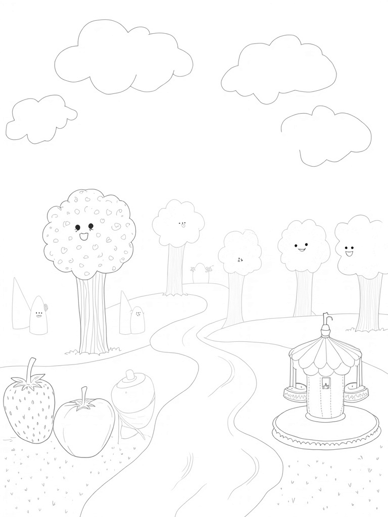 Check out this free, printable coloring page featuring a whimsical fruit orchard with giant apples, a chocolate river, and a donut carousel. Perfect for kids who love food-themed fun and creative coloring!