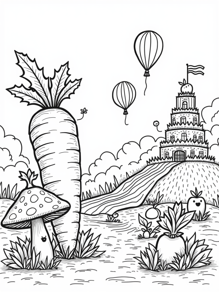 Check out this free, printable coloring page featuring a giant carrot, a friendly mushroom, and a candy path leading to a cake mountain. Perfect for kids who love fun food themes!