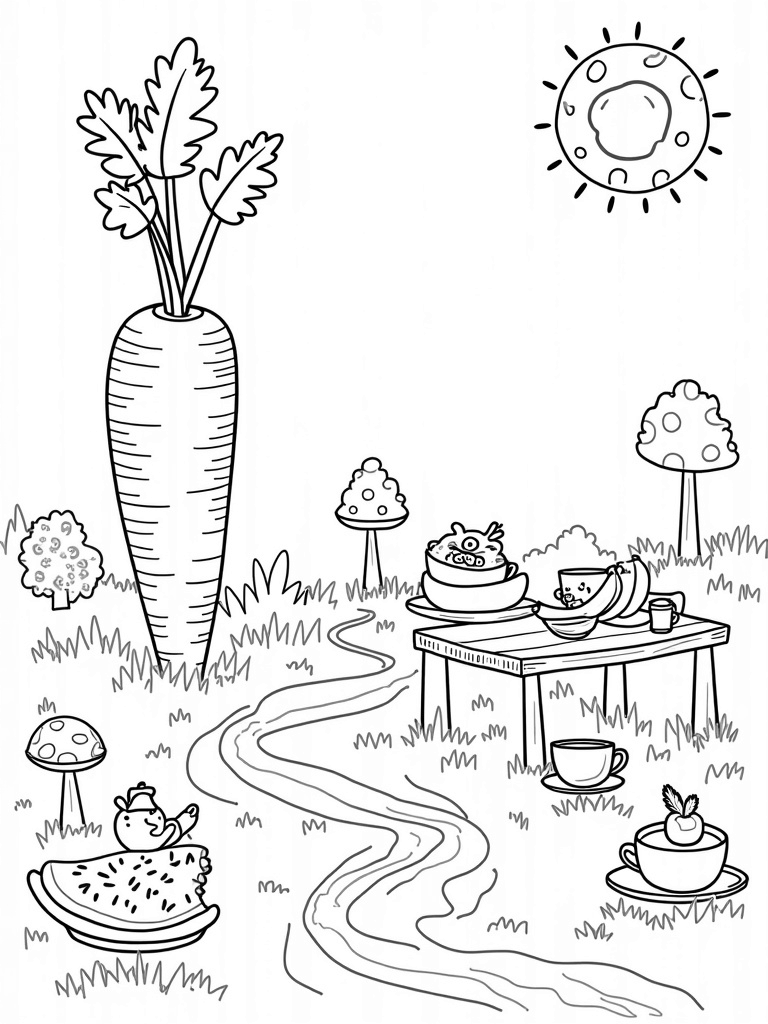 This scene is bursting with oversized veggies and playful fruit characters! Picture a giant carrot that’s so tall it could be a tree, with its leafy green tops spreading wide above. Nearby, colorful mushrooms come together to create a picnic table, and guess what? A big slice of watermelon is the perfect tablecloth for a fun picnic!