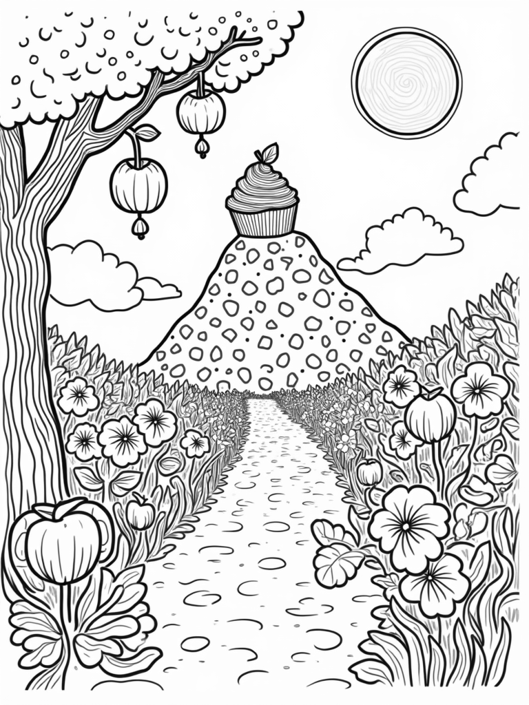 Giant Cupcake Mountain in a Fruity Orchard Coloring Page