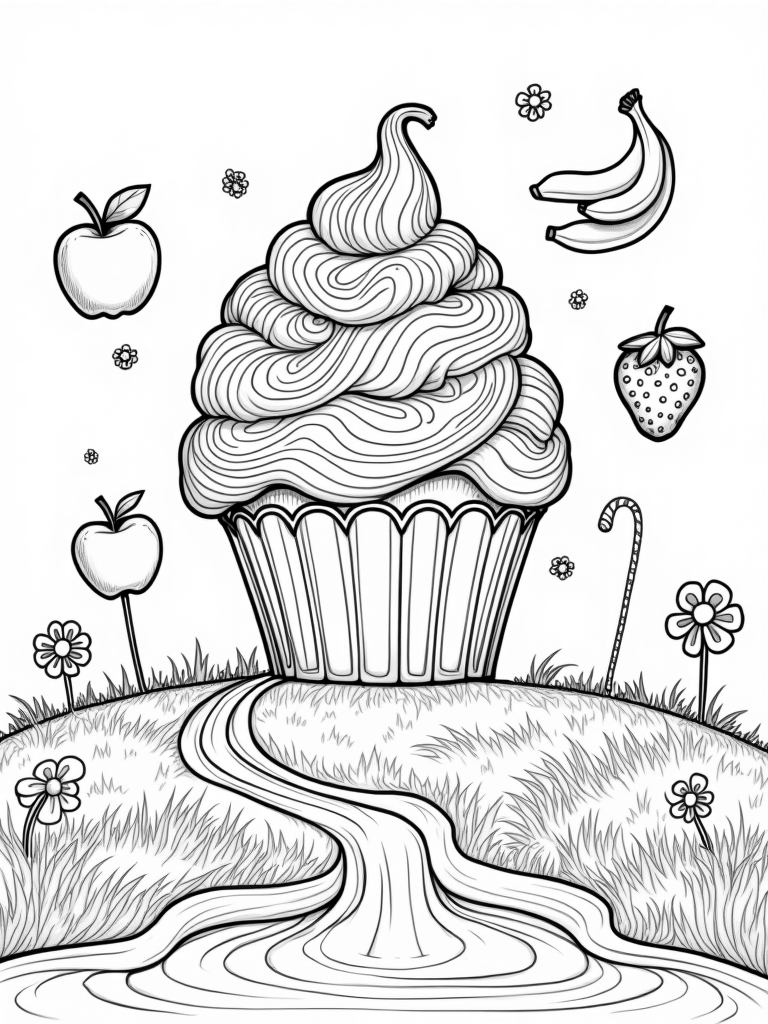 In the center, there’s a giant cupcake that looks too good to eat! It’s topped with swirling frosting that flows down like a waterfall. Around it, you’ll see oversized fruits like a bright red apple, a cheerful yellow banana, and a juicy strawberry, all floating in the air. Each fruit has fun patterns that will make your coloring pop!