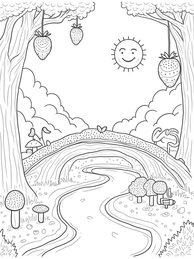 Imagine stepping into a magical orchard where the fruits are as big as your head! Here, giant strawberries hang like colorful lanterns, while a colossal banana arches over a bubbling chocolate river. It’s a place where everything feels larger than life and makes you want to grab some crayons and start coloring!