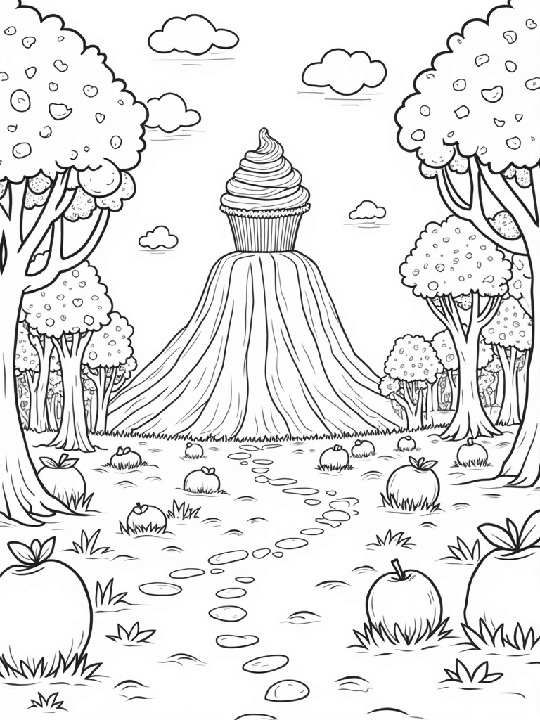 Giant Fruit Orchard with Cupcake Mountain Coloring Page
