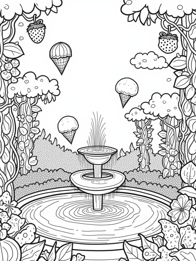 This delightful scene showcases a fruit garden where giant strawberries, blueberries, and bananas grow on tall vines like trees. At the heart of it all, a cheerful donut-shaped fountain pours rich chocolate syrup into a sparkling pond. Surrounding the fountain, you’ll find playful gummy bear bushes that just beg to be colored in bright hues!