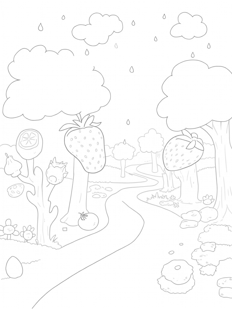 Look up, and you’ll find clouds shaped like fluffy pancakes drifting above. As if that’s not enough, syrupy rain is showering down like golden droplets, making it an even sweeter place to color. Every detail in this whimsical orchard invites little artists to unleash their imagination!