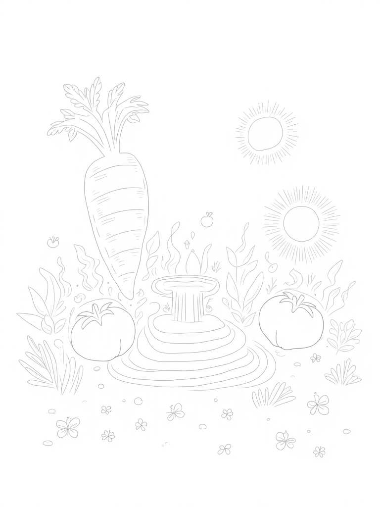 Imagine a garden where everything is bigger than life! Here, you’ll find a giant carrot that towers over the landscape like a skyscraper, its leafy greens waving in the breeze. Nearby, a huge tomato glows like a sunny day, with seeds radiating out like cheerful sunbeams. And don’t miss the winding path of macaroni noodles leading to an amazing chocolate fountain, surrounded by colorful candy flowers that look good enough to eat!