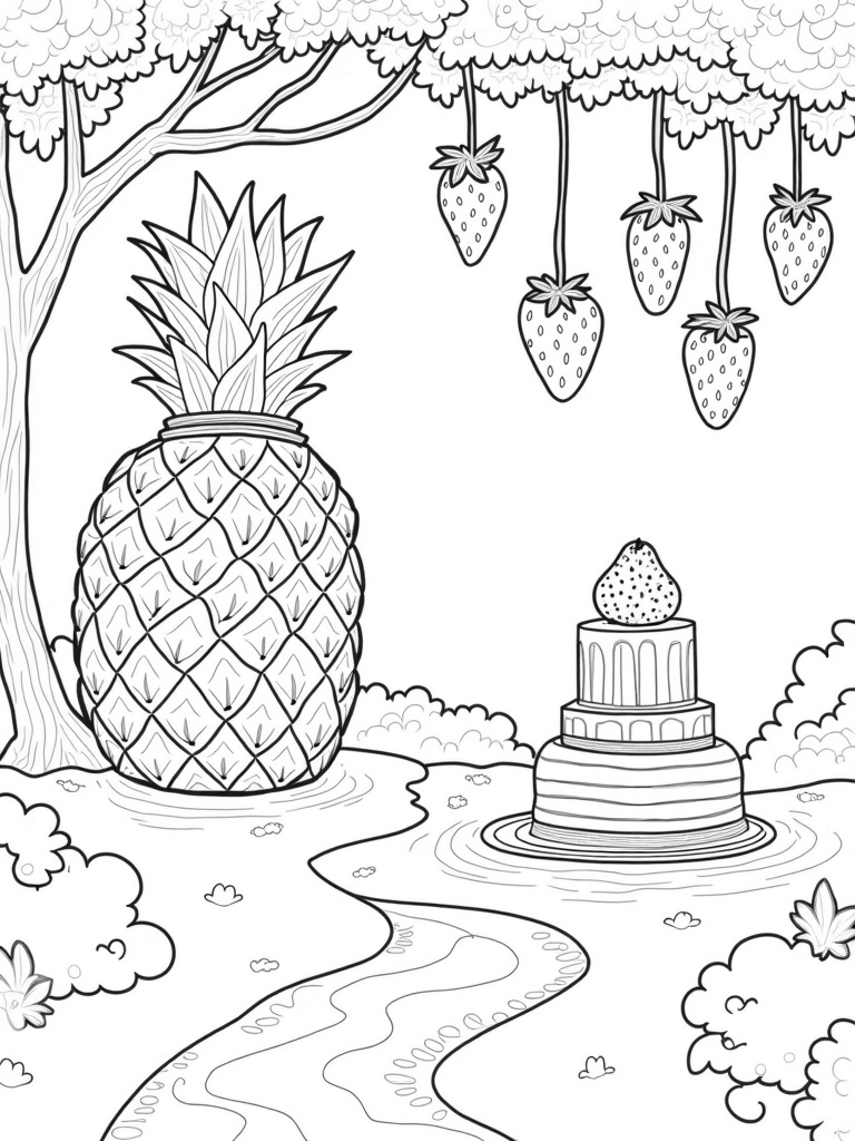 In this fun and vibrant orchard, you'll find oversized fruits hanging from the branches, with a big pineapple standing tall right in the middle. Look closely, and you’ll see strawberries floating around, each one sporting its own unique design. It's a fruit lover's dream come to life!