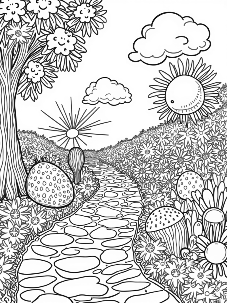 Check out this fun, free, and printable coloring page featuring a whimsical fruit garden filled with giant strawberries, a colossal lemon, and a chocolate river. Perfect for kids who love to color and let their imagination run wild!