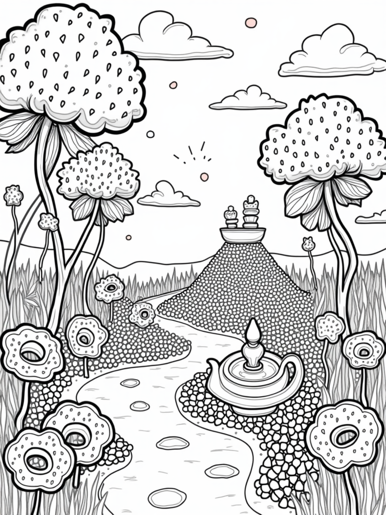 You’ll find a magical fruit garden where giant strawberries tower like trees, their leafy canopies creating a cozy shade. Below, a winding path made of colorful gummy bears leads the way to an enchanting lemonade fountain shaped like a teapot. Doesn't that sound delicious?