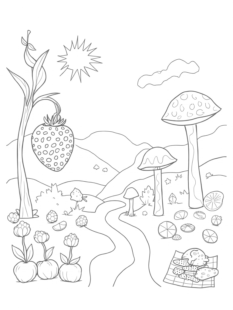 Check out this free, printable coloring page featuring a giant strawberry orchard, honey river, and a picnic spread. Perfect for kids who love food-themed fun! Let your creativity flow as you color this delightful scene.