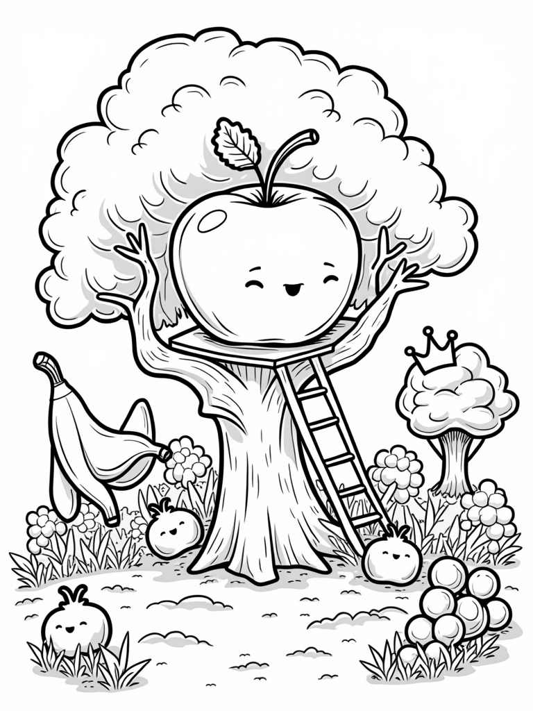 In this delightful fruit garden, you'll find oversized, smiling fruits that are just bursting with personality! The giant apple stands out as the perfect treehouse, complete with a twig ladder leading up to a leafy balcony. Can you imagine climbing up there? Nearby, a friendly banana swings from a vine, inviting you to join in the fun, while a group of grapes creates a bouncy path that looks like it would be a blast to hop on!