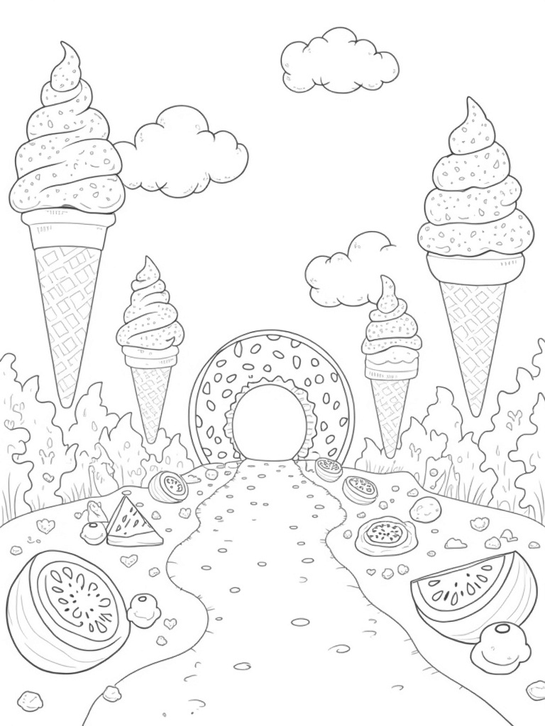 Ice Cream Cone Forest with Donut Archway Coloring Page