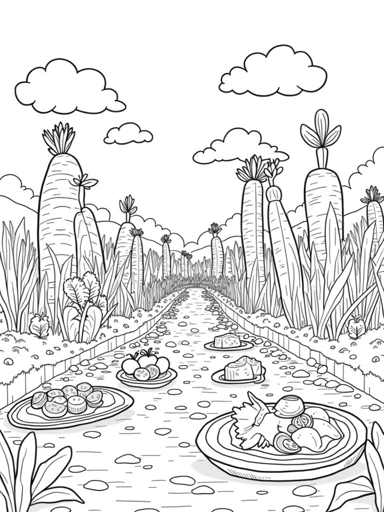 Oversized Carrots and a Tomato Sauce River Coloring Page