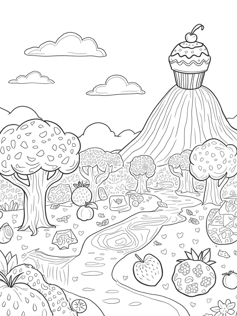 Look up to see fluffy cotton candy clouds drifting by, creating playful shadows on the ground. Candy-cane pathways wind through the orchard, leading to a towering cupcake mountain that’s just begging for some coloring! With swirls of frosting and a cherry-shaped hot air balloon on top, this scene is a treat for the eyes and the imagination.