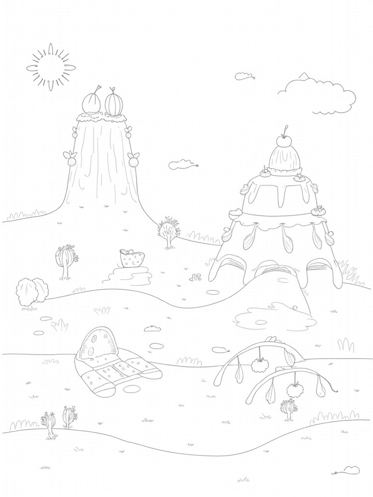 Dive into this free, printable coloring page featuring a whimsical orchard filled with oversized fruits, a cozy watermelon seat, and a towering cupcake mountain. Perfect for kids who love fun, colorful adventures!