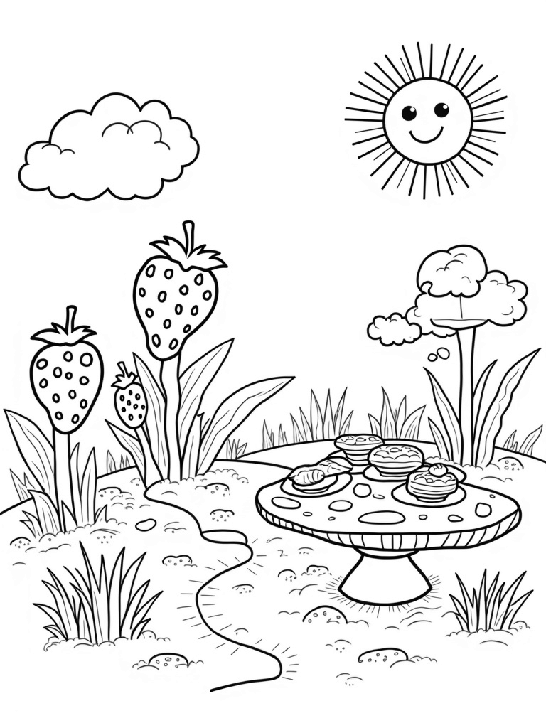Look up and you’ll see fluffy clouds shaped like cotton candy floating lazily in the sky, making the whole scene even sweeter. A cheerful sun with a big, bright smile beams down, lighting up this vibrant and playful garden. It’s a place where imagination runs wild, and every fruit and vegetable has a story to tell!