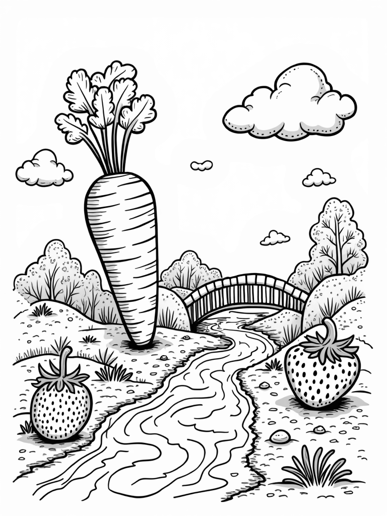 Imagine a world where fruits and veggies are way bigger than you! There’s a colossal carrot that stands tall like a skyscraper, with its leafy top spreading out like a big green umbrella. Just nearby, a river of golden honey swirls along, flowing under a charming bridge made of crunchy breadsticks. And don’t miss the giant strawberry in the foreground—it looks like a boulder, but it’s covered in fun, intricate patterns just waiting for some colorful creativity!