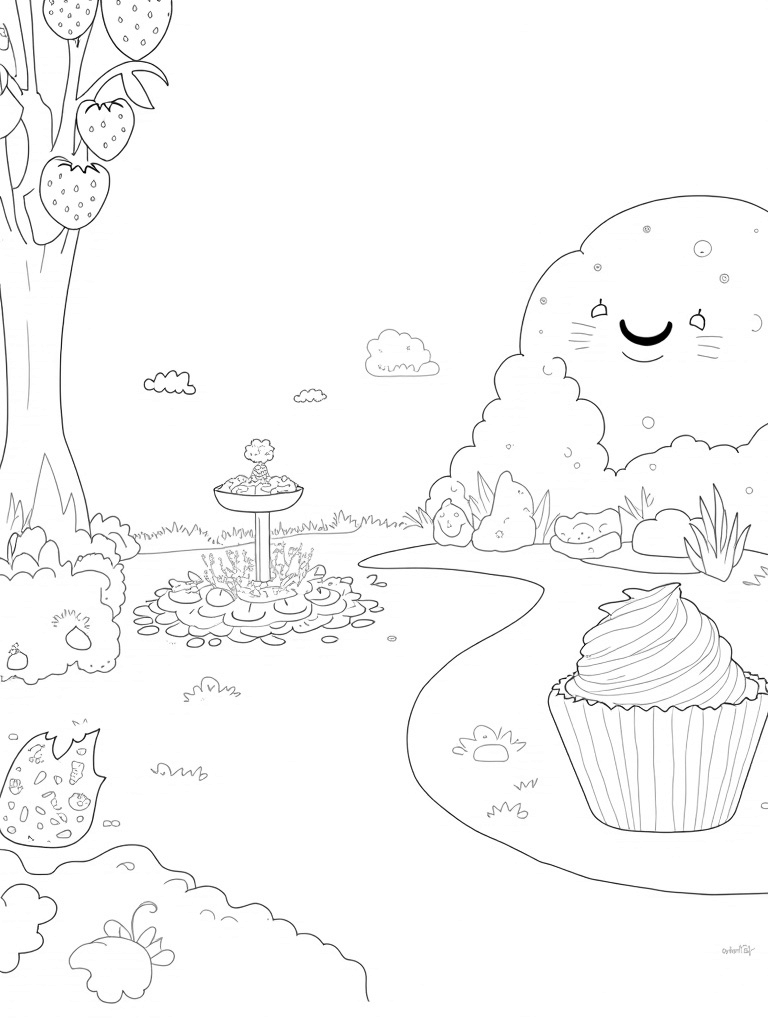 Check out this free, printable coloring page featuring a whimsical fruit garden with giant strawberries, a chocolate fountain, and a smiling cupcake. It's perfect for kids who love food-themed art!