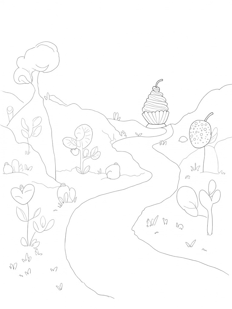 Check out this free, printable coloring page featuring a whimsical fruit garden filled with oversized strawberries, a chocolate river, and a giant cupcake. Perfect for little artists who love food-themed fun!
