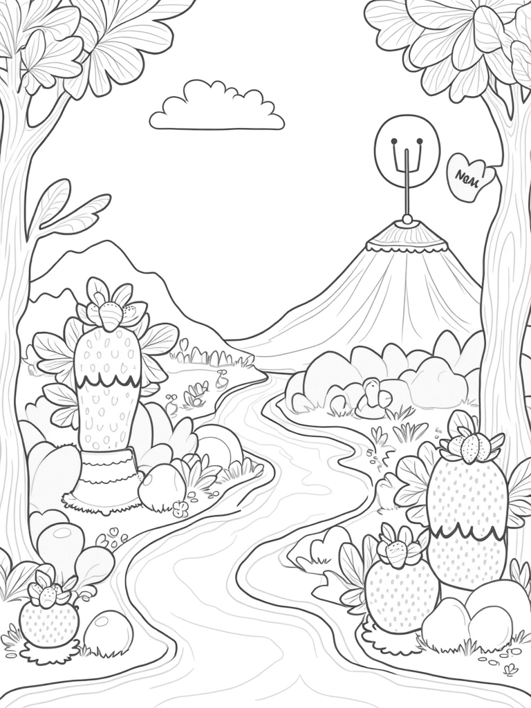 This coloring page showcases a playful fruit garden where strawberries are as tall as trees, with their leafy tops spiraling up to the sky. Right in the middle, there's a winding river of rich chocolate that flows beautifully through the scene, flanked by adorable gummy bear boulders. In the background, a giant cupcake mountain stands proudly, its colorful frosting flowing down like a delicious waterfall!