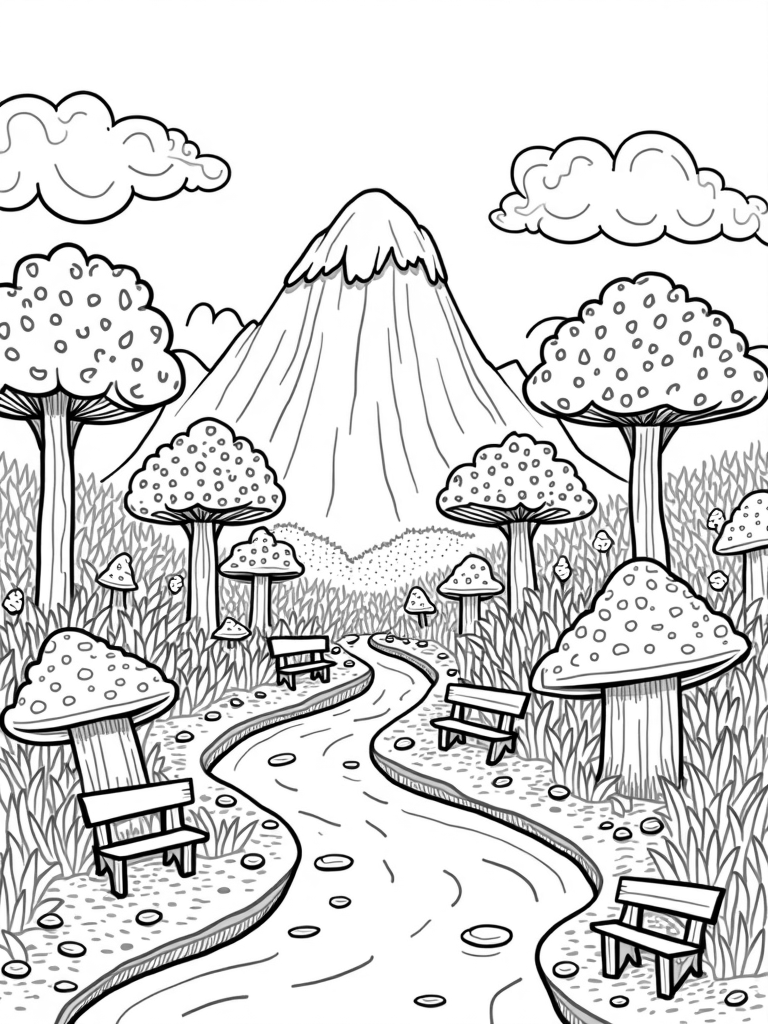 If you love mushrooms, you'll adore the giant polka-dotted ones that serve as benches for little creatures to rest. And don’t miss the towering cupcake mountain in the background, complete with swirly icing peaks and candy cane paths. It’s a sweet, colorful place that sparks creativity and imagination!