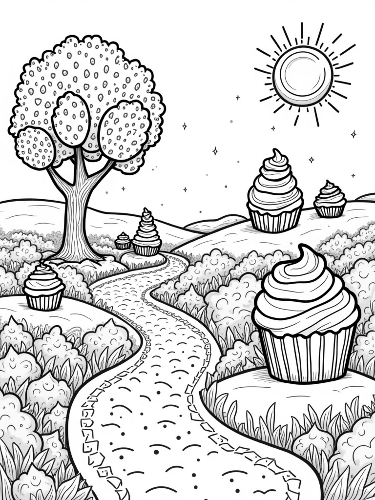 Just a little further, you’ll find a hill covered in giant cupcakes, each one sporting swirls of frosting that remind you of fluffy clouds. And don’t miss the sun made of orange slices shining brightly, with colorful sprinkles falling from the sky like tiny, sweet raindrops. It's a delightful scene bursting with yummy surprises!