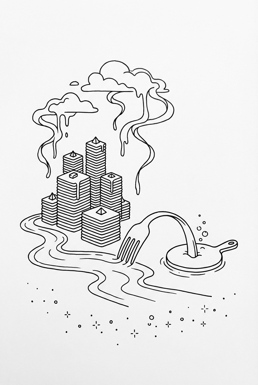 Imagine a whole town built from fluffy pancakes, each stack rising like tiny skyscrapers over a shiny river of amber syrup. White butter clouds float lazily above, melting into ribbons that drape over the rooftops. A giant silver fork stretches across the river, its tines acting as a bridge to a lone skillet island where sizzling oil bubbles like little lanterns. Scattered spice crystals glitter on the riverbank, catching the light just like a sky full of stars.