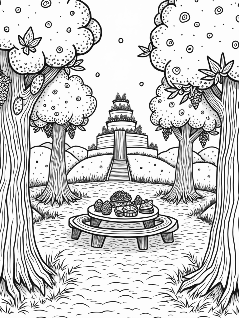 Upside Down Fruit Orchard with Candy Canes and a Cake Hill Coloring Page