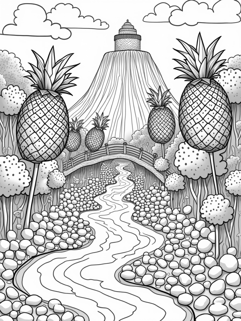 Whimsical Fruit Orchard with Chocolate River and Cake Mountain Coloring Page