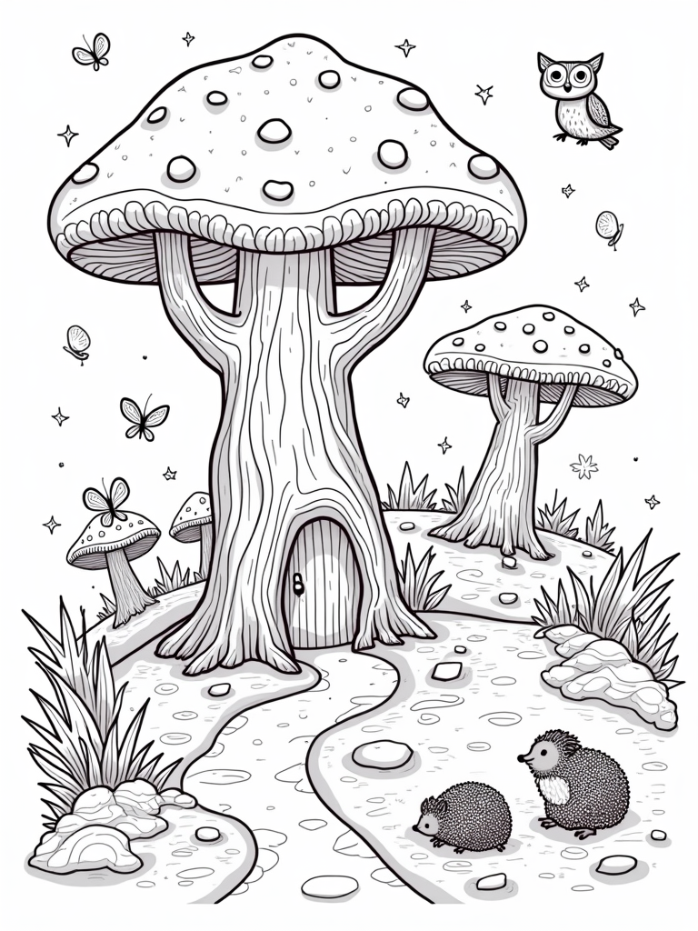 In this enchanting scene, you'll find oversized mushrooms sprinkled around like vibrant umbrellas, creating a fun backdrop for your coloring adventure. A winding path made of candy corn leads the way to a tall tree, which has a little door carved right into its trunk. It’s like a secret hideout just waiting to be discovered!