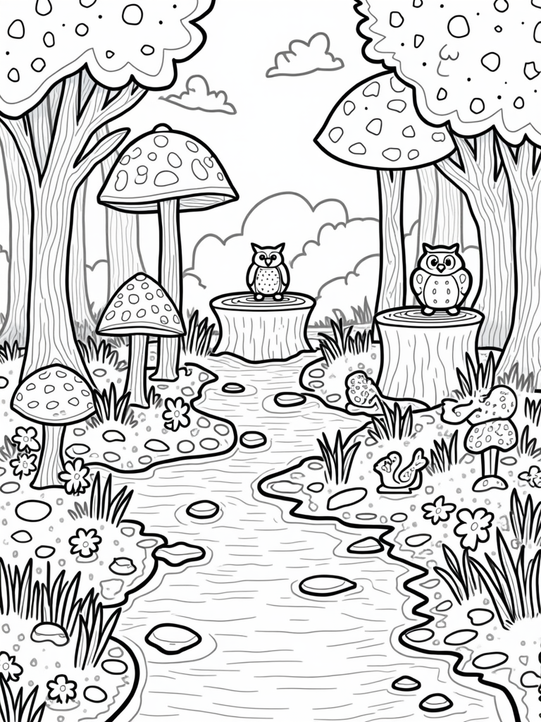 This scene takes you to a magical forest glade filled with oversized mushrooms in all shapes and colors. Right in the center, there's a giant tree stump that looks perfect for sitting and enjoying nature. The surface is covered with beautiful leaves and flower patterns, just waiting for some bright colors to bring them to life!