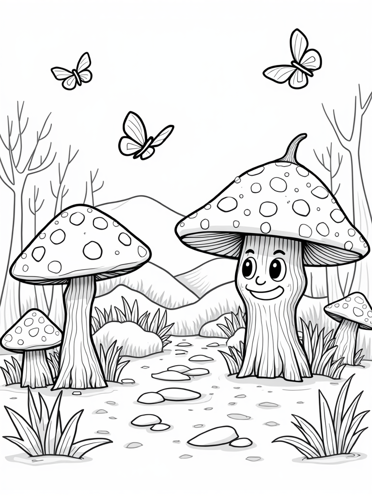 In this magical scene, oversized mushrooms with playful polka dots create a vibrant circle around a giant acorn. This isn’t just any acorn; it’s standing tall, wrapped in a twisting vine that adds to the charm. Close by, a tree stump with a big, friendly grin and sparkling eyes invites you to stay a while. Above, colorful butterflies dance in the air, making the whole scene feel alive.