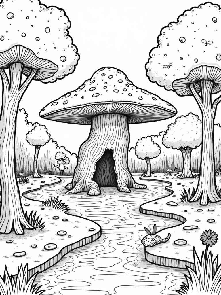 This scene is all about a magical forest clearing where giant mushrooms stand tall like trees. Their caps are covered in beautiful patterns just waiting for your favorite colors! At the center, there's a winding stone path that leads to a huge, twisted tree stump. Peek inside, and you'll find oversized, bright flowers that look like they popped right out of a fairy tale!