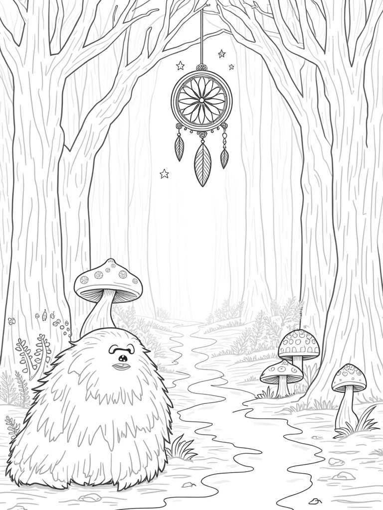 Look closely, and you’ll spot delicate dreamcatchers hanging from the tree limbs, their intricate webs catching twinkling stars. Below, a gentle stream flows through the forest, and if you peek beneath the water’s surface, you might just see pebbles shaped like your favorite woodland creatures. This scene is packed with delightful details just waiting for your colorful touch!