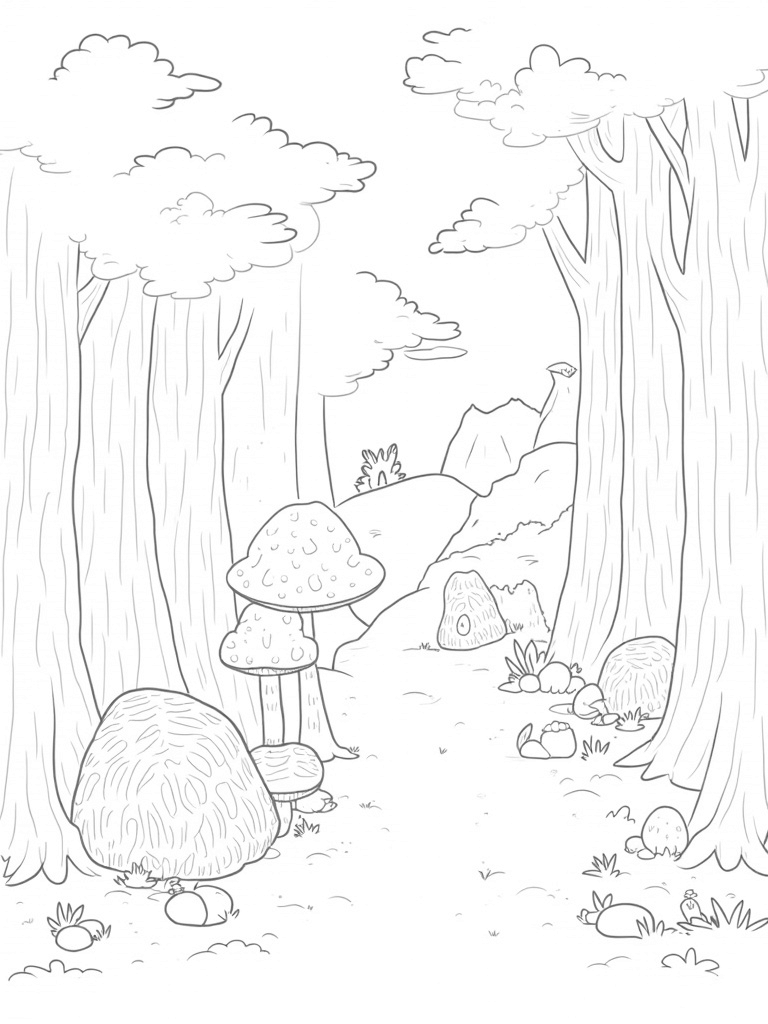 As you color, notice the fluffy clouds floating above, shaped like cute forest creatures. It’s a playful touch that sparks the imagination! In the distance, a crooked tree stands on a hill, with a mysterious hollow that glows softly. What secrets could be hiding inside? Your creativity can bring this enchanted forest to life, one colorful stroke at a time.