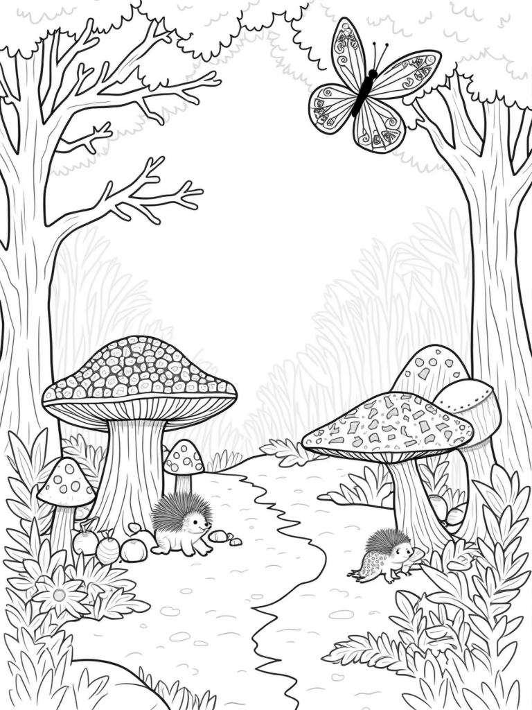 Above all the fun, a whimsical, oversized butterfly flutters gracefully. Its wings are full of swirling designs that invite your favorite colors. Imagine how beautiful it would look with a splash of pink or blue! The towering trees in the background have knotted trunks and spiraling branches, and if you look closely, you might even see their leaves shaped like woodland creatures.