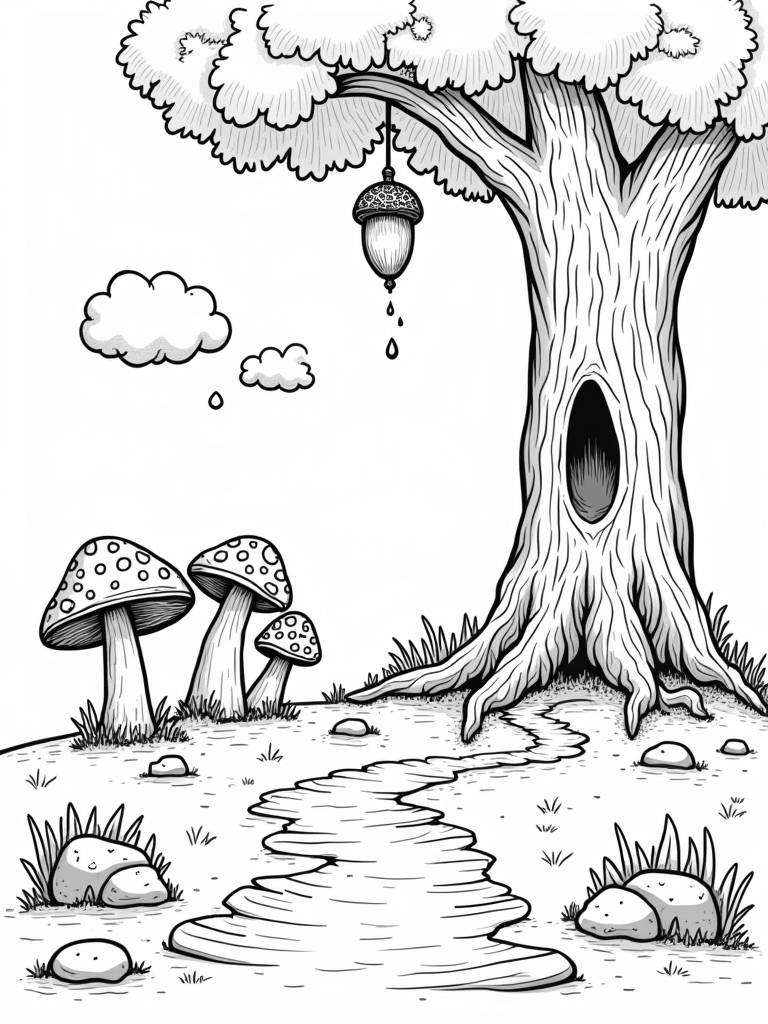 Look up and you’ll see fluffy clouds that are shaped like woodland creatures, bringing a smile to your face. And don't miss the giant acorn hanging from a branch, dripping with golden sap! It’s a delightful detail that makes this forest clearing feel even more whimsical. Grab your favorite crayons or markers, and let your imagination run wild!