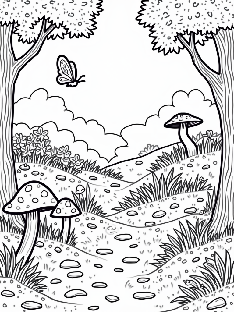 This delightful scene showcases a friendly gruffalo standing proudly next to a towering tree with a hollow trunk. Surrounding him are oversized, brightly colored mushrooms that seem to dance in the forest clearing. A winding pebble path invites little ones to follow along, while curious acorns and leaves playfully gather nearby. Look up and you might just spot a big, cheerful butterfly fluttering above the scene, adding to the magical vibe!