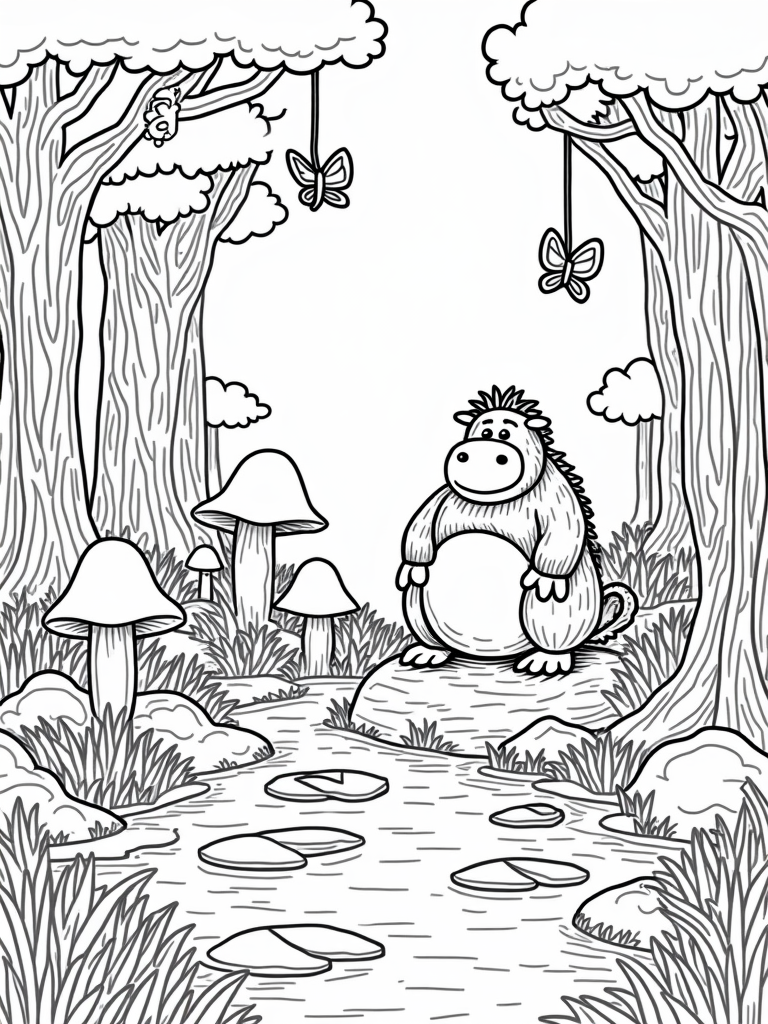 You’ll find a giant, friendly gruffalo sitting on a big rock, looking quite happy in a magical forest clearing. Surrounded by oversized mushrooms and colorful butterflies, he seems like the perfect buddy for a day of coloring. A winding path made of smooth pebbles leads to a sparkling pond, where lily pads float lazily on the water's surface.