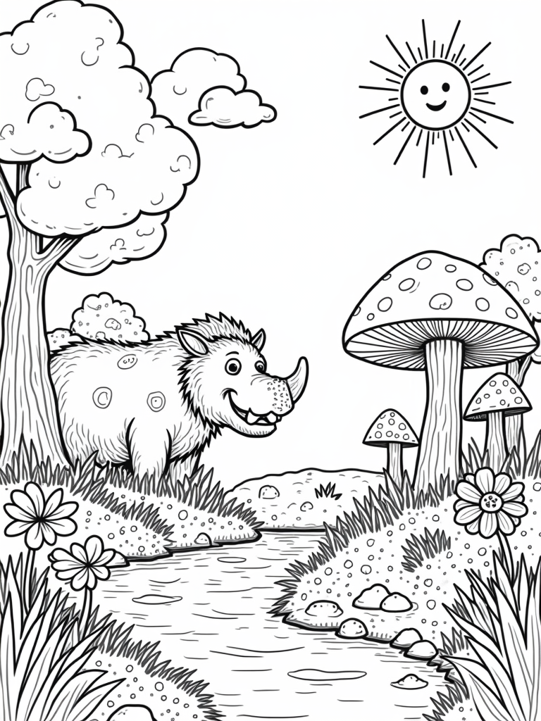 Check out this free, printable coloring page featuring a friendly gruffalo in a vibrant forest clearing. With oversized mushrooms, a sparkling stream, and fluffy clouds, it’s perfect for kids who love imaginative scenes. Grab your crayons and let the fun begin!