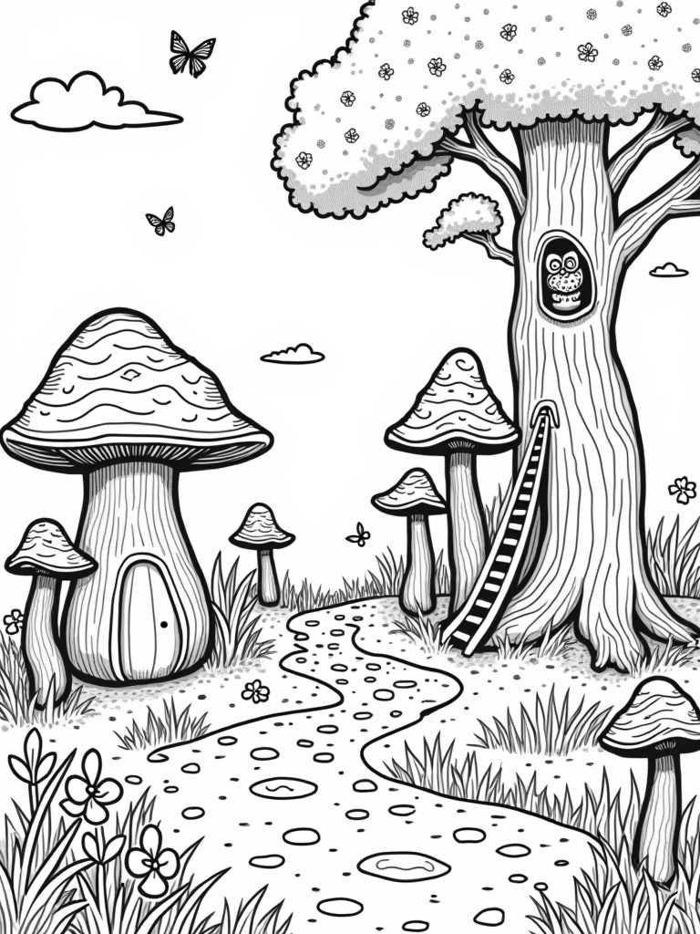 You’re looking at a delightful scene in the heart of a forest clearing! There are oversized mushrooms with funky patterns that will make your crayons dance. In the center, a giant acorn catches your eye, complete with a tiny door, perfect for a little forest critter. Around it, flowers with swirly petals add a playful vibe to the whole setting.